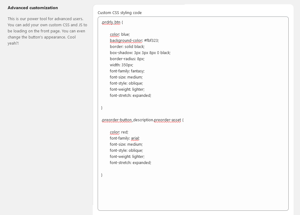 In order to cater to different design preferences for buttons, we have included a “Custom CSS styling code” field under the “Advanced customization” section. This allows users to input their own CSS code to apply any design they desire, providing great flexibility and customization options. This is a highly beneficial feature as it provides the ability to create unique and personalized designs. Let’s explore the various options that are available.